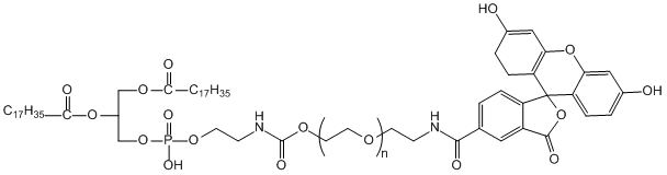 DSPE-PEG-FITC(1,2-二硬脂酰-sn-甘油基-3-磷酸乙醇胺-N-(聚乙二醇) - 熒光素(鈉鹽)是具有DSPE磷脂和熒光素FITC染料性能的線(xiàn)性異雙功能PEG化試劑。