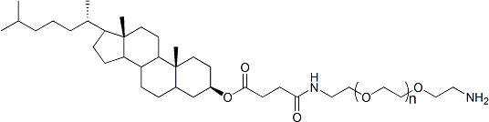 CLS-PEG-NH2(膽固醇聚乙二醇胺)是一種具有良好水溶性的親脂性脂質(zhì)PEG綴合物。PEG膽固醇衍生物可用于制備脂質(zhì)體以改善包封藥物的循環(huán)時(shí)間。它們也可用于非病毒轉染試劑。
